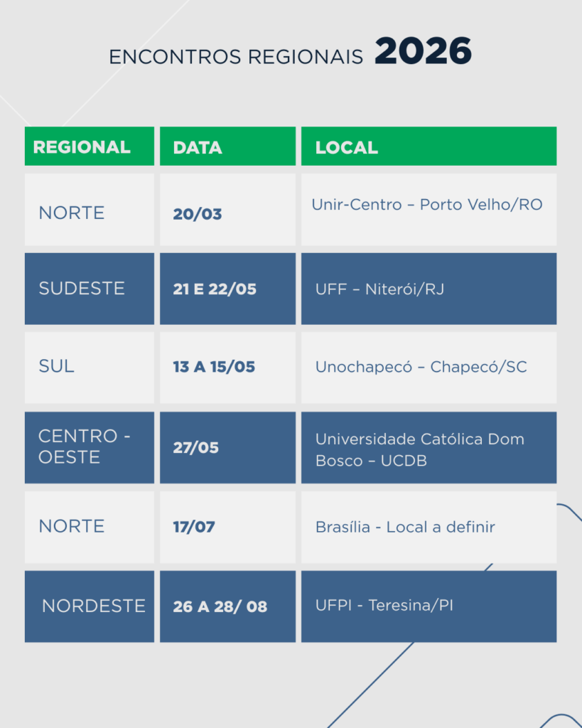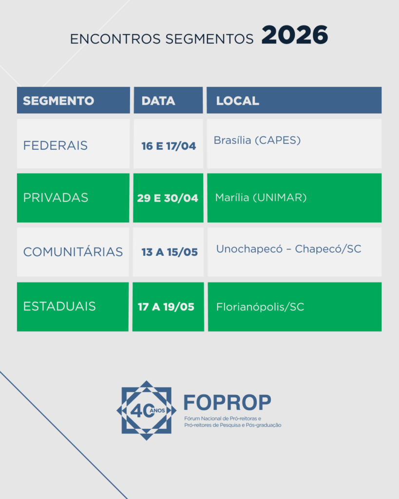 O Fórum Nacional de Pró-Reitores e Pró-Reitoras de Pesquisa e Pós-Graduação (FOPROP) divulga o cronograma oficial de reuniões presenciais para 2026. O calendário contempla encontros regionais, reuniões por segmento institucional e a reunião do Diretório Nacional (FOPROP-DN), distribuídos ao longo do ano com o objetivo de garantir a participação ampla das cerca de 300 instituições associadas em todas as regiões do país.